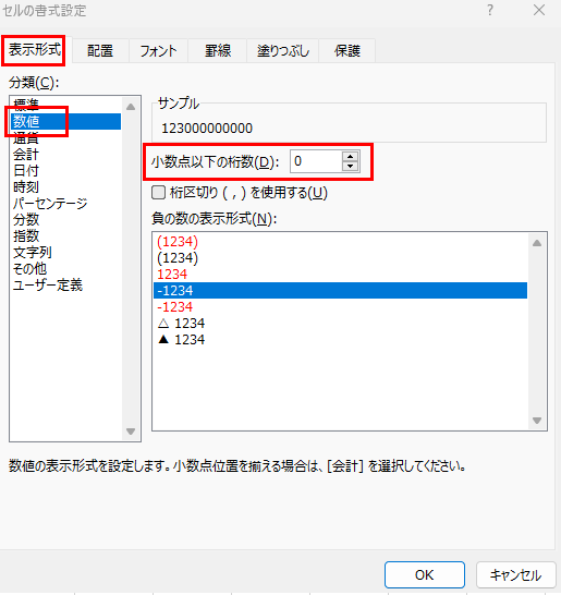 「表示形式」タブで「数値」を選択し、小数点以下の桁数を「0」に設定して「OK」をクリックします。