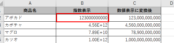 するとE+11のような指数表示が「123000000000」のような整数表示に変わります。