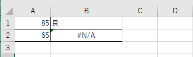 誤った例:=IFS(A1>=60,”及”,A1>=70,”可”,A1>=80,”良”,A1>=90,”優”,TRUE,”不可”)