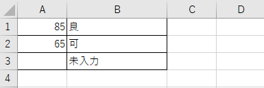 =IFS(A1=””,”未入力”,A1>=90,”優”,A1>=80,”良”,TRUE,”可”)