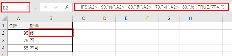 正しい例:=IFS(A1>=90,”優”,A1>=80,”良”,A1>=70,”可”,A1>=60,”及”,TRUE,”不可”)