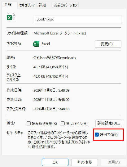 エクセルで読み取り専用が解除されない原因2【ファイルのブロック属性】