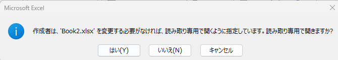 保護ビューとは別に、ファイルを開く際に「読み取り専用で開くことをお勧めします」というダイアログが表示される場合もあります。