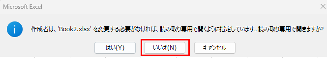 ファイルを開く際に表示される「読み取り専用で開くことをお勧めします」ダイアログで、「いいえ」をクリックして編集可能な状態で開きましょう。