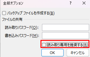 「全般オプション」ダイアログが開いたら、「読み取り専用を推奨する」のチェックを外して「OK」をクリックしてください。