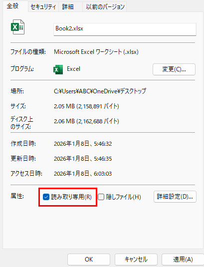 さらに、全般オプションで「読み取り専用を推奨する」のチェックを外せば読み取り専用推奨ダイアログが表示されなくなり、ファイル属性の読み取り専用チェックも確認する必要があります。