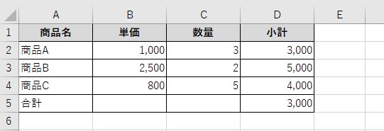 自動計算モードはエクセルのデフォルト設定で、セルの値を変更するたびに関連するすべての数式が即座に再計算されます。上記のサンプルでB2の単価を変更した場合、D2の小計とD5の合計が瞬時に更新されるのが自動計算モードの動作です。
