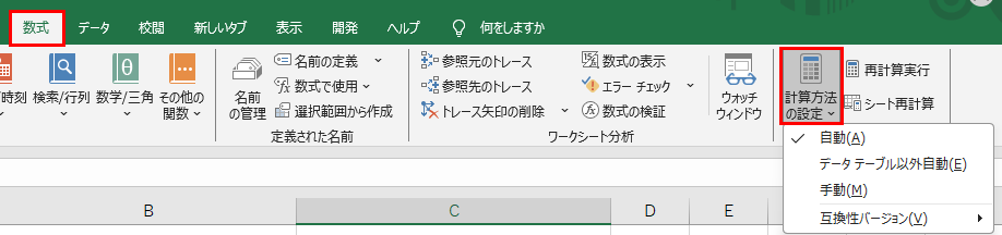 ・「数式」タブ→「計算方法の設定」から自動・手動の切り替えができる