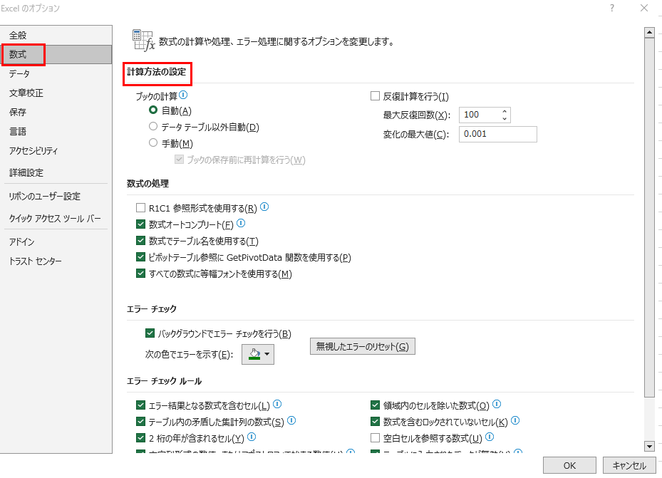 同じ画面では「反復計算を使用する」「最大反復回数」「変化の最大値」など、計算に関する詳細設定も管理できます。循環参照を意図的に使用している場合などに活用できる設定です。
