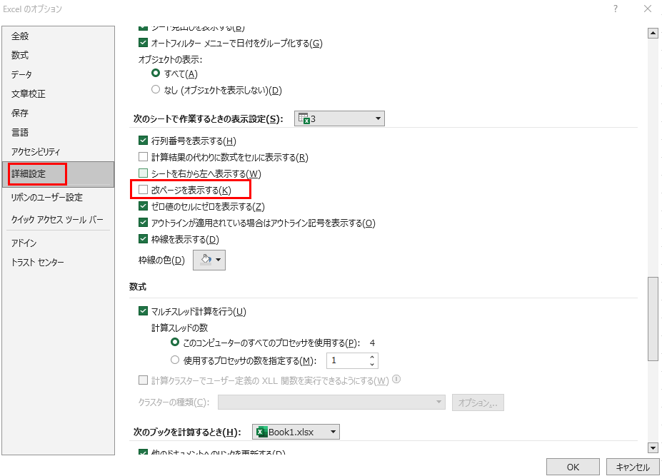 「次のシートで作業するときの表示設定」セクションにある「改ページを表示する」のチェックを外して「OK」をクリックします。