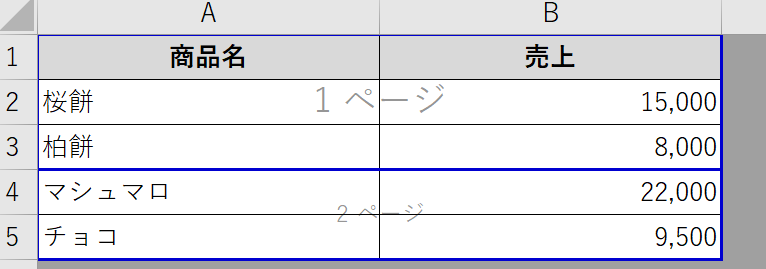 この状態で青い実線を印刷範囲の外側(ページ区切りを表すエリア外)にドラッグすることで改ページを削除できます。