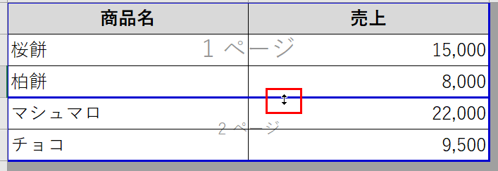 改ページを縮小方向(印刷範囲を狭くする方向)にドラッグすると1ページに収まるデータが少なくなり、拡大方向(印刷範囲を広くする方向)にドラッグすると1ページに収まるデータが多くなります。