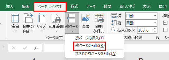横方向の改ページを削除する場合は改ページの直下のセルを、縦方向の改ページを削除する場合は改ページの直右のセルをそれぞれ選択してから「改ページの解除」を実行します。