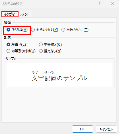 PHONETIC関数で返されるふりがなの種類(ひらがな・カタカナ・半角カタカナ)は、「ふりがなの設定」からひらがなに変更できます。
