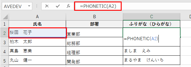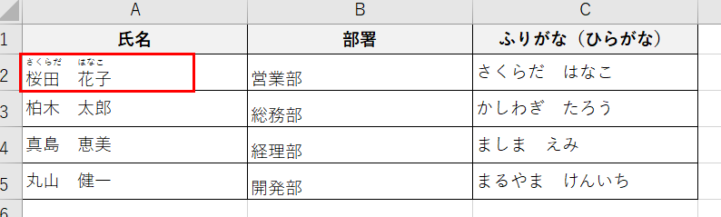 A2セルに「桜田 花子」が入力されている場合、PHONETIC関数はIMEの入力履歴から保持されているふりがな情報を取り出して返します。