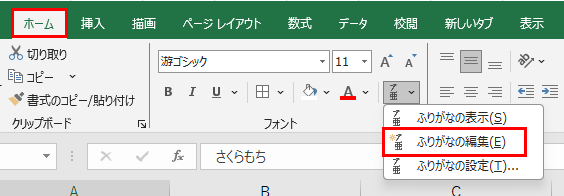 「ホーム」タブの「ふりがなの表示/非表示」ボタン横の矢印をクリックして「ふりがなの編集」を選択します。