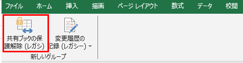 「共有ブックの保護」が設定されている場合は「校閲」タブに「共有ブックの保護の解除」ボタンが表示されます。