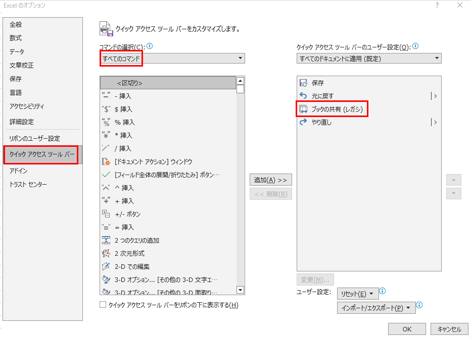 ・ボタンが見当たらない場合:クイックアクセスツールバーのカスタマイズから「ブックの共有(レガシ)」を追加する