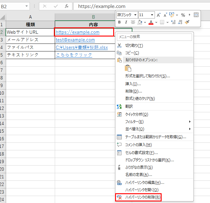 ハイパーリンクが設定されているセルを右クリックします。