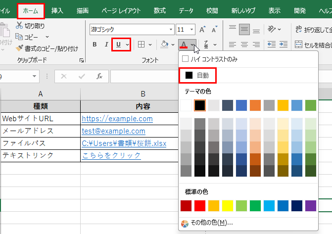 この場合は「ホーム」タブからフォントカラーを「自動」に変更し、下線ボタンをクリックして下線を解除することで通常のテキスト表示に整えましょう。