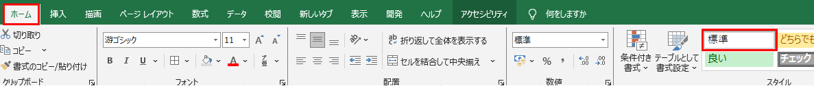 または「ホーム」タブの「スタイル」グループにある「セルのスタイル」から「標準」を適用することでも書式をリセットできます。