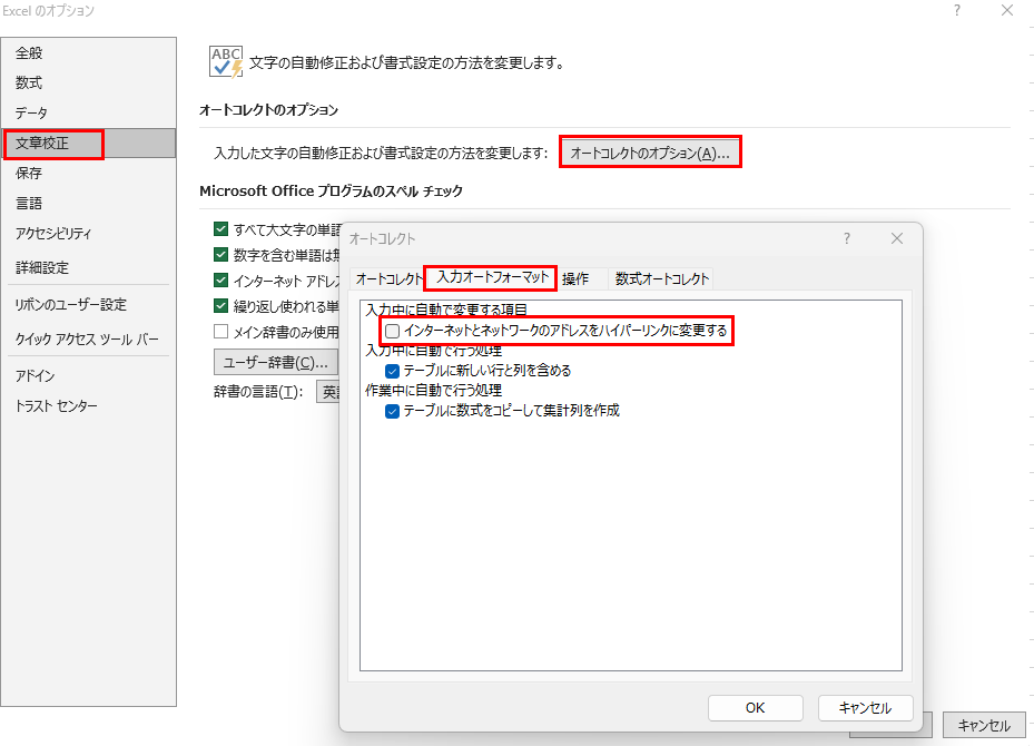 自動ハイパーリンクの設定をオフにする手順