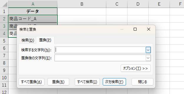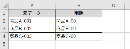 A列に「商品コード_A」「商品コード_B」「商品コード_C」といったデータがあり、末尾の「_」以降を削除したい場合を考えてみましょう。