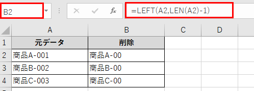 具体的な例として、A列に「商品A-001」「商品B-002」「商品C-003」といったデータがあり、末尾の1文字を削除したい場合を考えてみましょう。