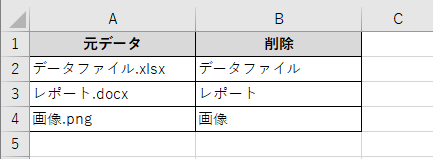 A列に「データファイル.xlsx」「レポート.docx」「画像.png」といった拡張子付きのファイル名があり、拡張子部分(ピリオド以降)を削除したい場合を考えてみましょう。