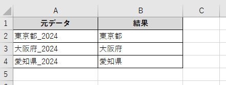 A列に「東京都_2024」「大阪府_2024」「愛知県_2024」といったデータがあり、末尾の「_2024」を削除したい場合を例にしてみましょう。