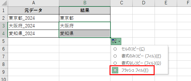 エクセルが自動的にパターンを認識し、残りのセルにも「_2024」を除いた都道府県名だけが自動入力されます。