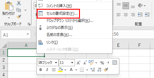 表示されないセルを選択して、右クリックから「セルの書式設定」を選択するか、「Ctrl」+「1」を押します。