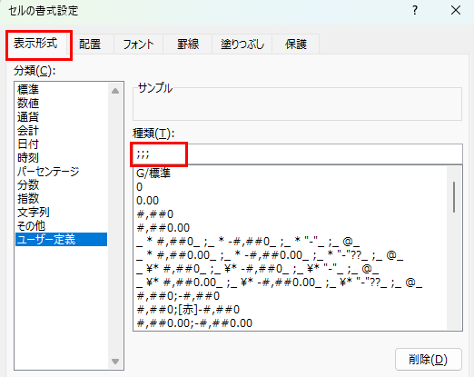 「;;;」以外にも、特定の条件下でのみ表示しないような複雑なユーザー定義書式が設定されている場合があります。