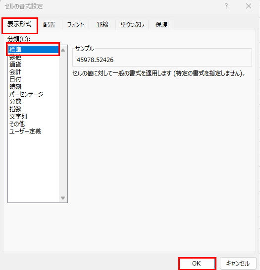 「セルの書式設定」ダイアログで、「分類」から「標準」を選択して「OK」をクリックします。