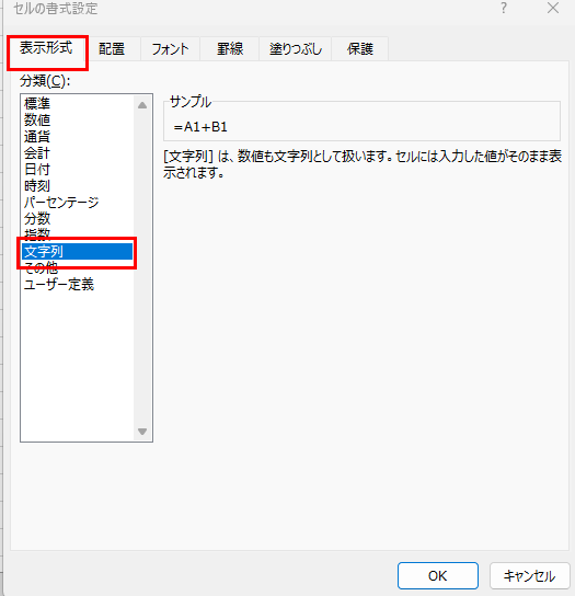 セルの書式設定が「文字列」になっていると、入力した数式はそのまま文字として扱われ、計算が実行されません。