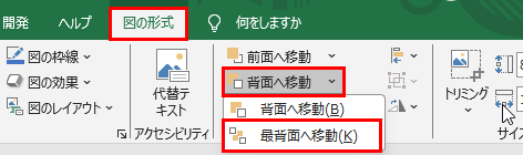または、「図形の書式」タブから「背面へ移動」→「最背面へ移動」を選択しても同じ効果が得られます。