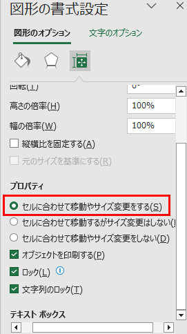 図形の位置だけを固定したい場合は、「セルに合わせて移動するがサイズ変更はしない」を選択すると良いです。
