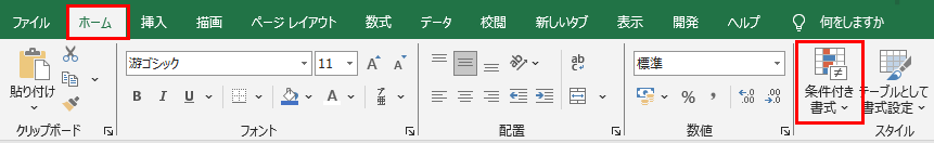 対象のセル範囲を選択し、「ホーム」タブの「条件付き書式」をクリックしましょう。