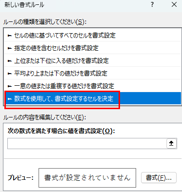 「新しいルール」を選択し、「数式を使用して、書式設定するセルを決定」を選びます。