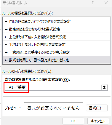 例えば、「重要」という文字が入力されているセルだけを太枠で囲みたい場合、数式に以下を入力します。
