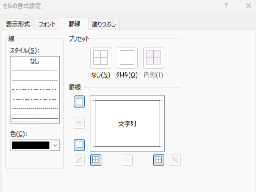 「書式」ボタンをクリックし、「罫線」タブで太い枠線を設定します。