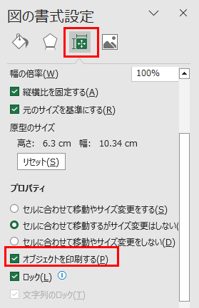 ・印刷する場合:図形の「オブジェクトを印刷する」にチェック