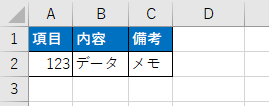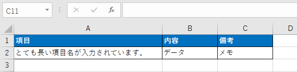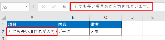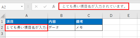 隣のセルに何かデータが入っている場合、はみ出した文字は隠れて表示されなくなります。