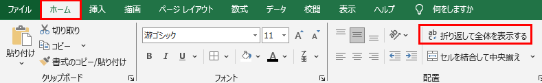 ・折り返し表示:ホームタブから「折り返して全体を表示する」を選択
