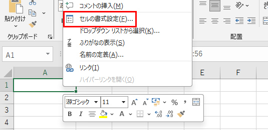 文字が隠れているセルを選択し、右クリックして「セルの書式設定」を開きます。