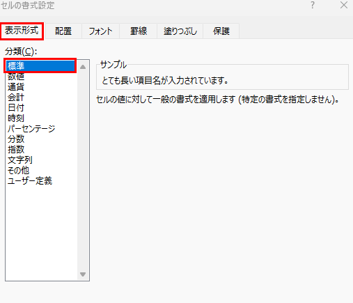 ・表示形式の確認:セルの書式設定で標準形式に変更