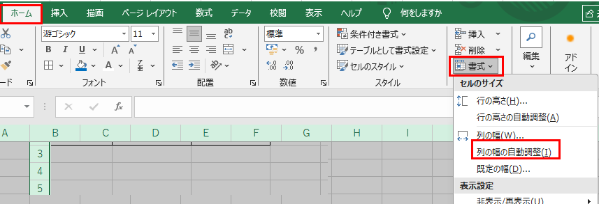 ホームタブの「書式」をクリックし、「列の幅の自動調整」を選択しましょう。