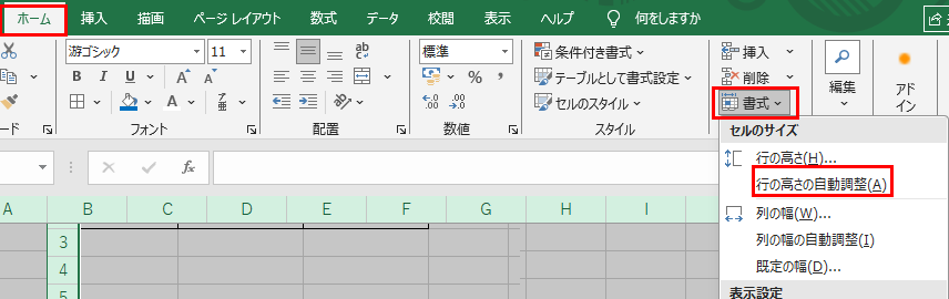 ・行の高さ:行の境界線をダブルクリックして自動調整