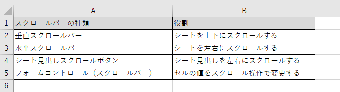 また、エクセルにはシート上に配置できる「フォームコントロール」のスクロールバーもあります。これはセルにリンクさせて数値を視覚的に操作するためのUI部品であり、通常のスクロールバーとは別の用途で使われます。