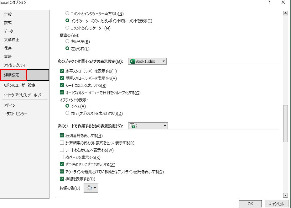 「水平スクロールバーを表示する」にチェックを入れると水平スクロールバーが表示され、外すと非表示になります。「垂直スクロールバーを表示する」にチェックを入れると垂直スクロールバーが表示され、外すと非表示になります。「シート見出しを表示する」はシート名タブの表示・非表示を切り替えます。